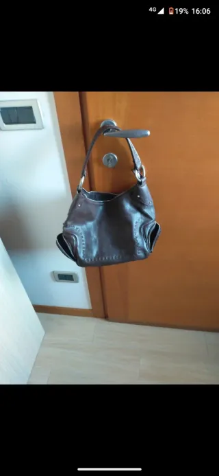 Borsa a mano in pelle marrone, con dettagli impunturati e tasche esterne. - Design con impunture decorative. - Due tasche laterali esterne. - Manici con anelli metallici.