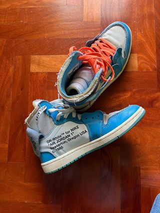 Vendo queste sneakers Nike x Off-White Air Jordan 1. Sono in buone condizioni, anche se mostrano qualche segno di usura. - Modello Air Jordan 1 - Collaborazione con Off-White - Dettagli in bianco e blu