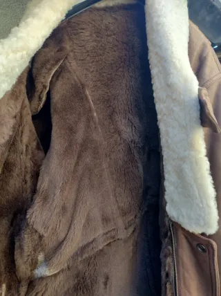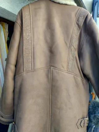 Elegante giacca in tessuto effetto pelliccia, dal colore marrone intenso. Presenta un dettaglio sul retro con due bottoni e una fascia in pelliccia. - Tessuto morbido e caldo. - Dettaglio posteriore con bottoni e fascia in pelliccia.