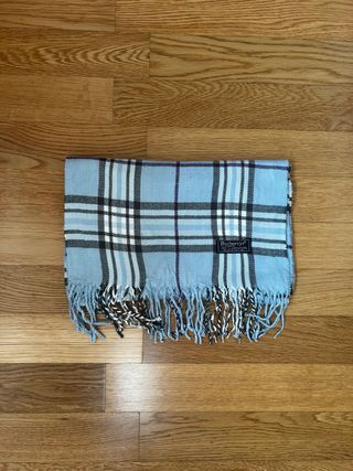 Sciarpa Burberry in lana, mai indossata e in perfette condizioni. - Motivo a quadri iconico. - Tonalità azzurra con dettagli bianchi e neri. - Frange alle estremità.