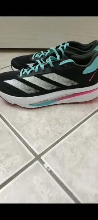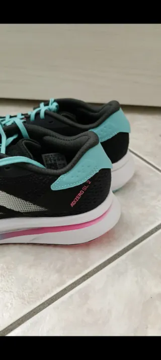 Scarpe da corsa Adidas Adizero SL 2 in nero con dettagli rosa e turchesi. Design moderno e leggero. - Tomaia in mesh traspirante. - Intersuola con tecnologia Lightstrike Pro. - Suola in gomma per un'ottima aderenza.