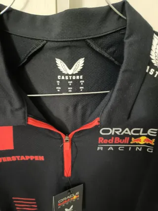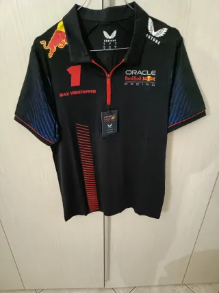 Maglia polo da uomo Red Bull Racing. - Colore nero con dettagli rossi e blu. - Logo Red Bull Racing e Oracle sul petto. - Numero 1 e nome Max Verstappen stampati sul davanti. - Logo Castore sul colletto e sulle maniche.