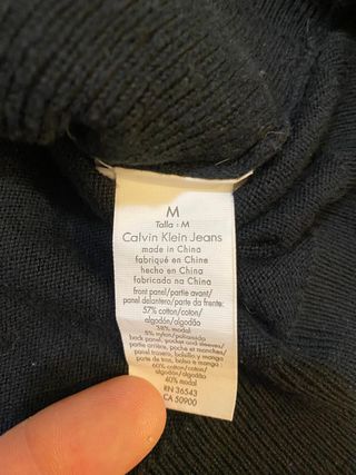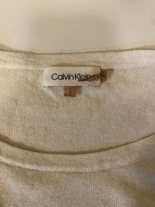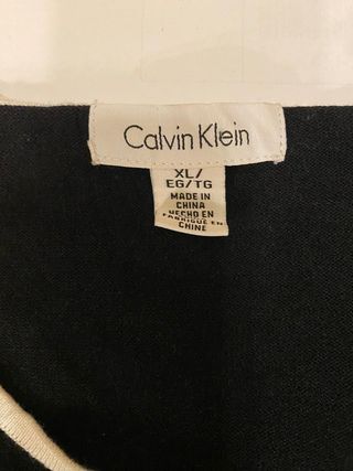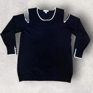Elegante maglione Calvin Klein con un design moderno. - Spalle scoperte con bordino bianco. - Polsini con bottoni decorativi e bordino bianco. - Scollo rotondo rifinito.