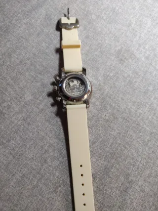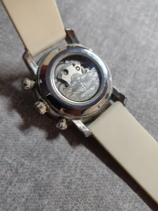 Orologio automatico con cassa color argento e cinturino beige. Funzionante - Movimento a vista sul retro. - Dettagli del marchio visibili.