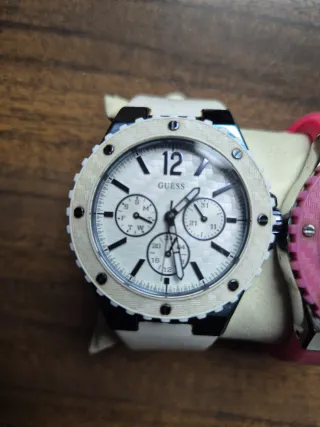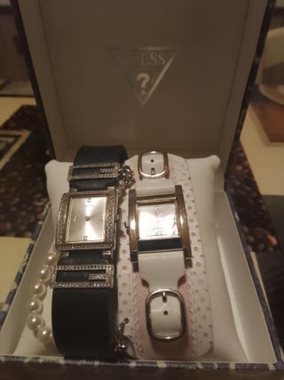 Elegante set di due orologi Guess da donna, uno con cinturino nero e l'altro bianco. Perfetti per completare ogni look. Pile da cambiare la scatola è originale ma non so se appartiene a uno dei due ho diversi orologi di questa marca - Orologio con cinturino nero e dettagli luminosi. - Orologio con cinturino bianco e design moderno. - Inclusa scatola originale Guess. Lo stato e tra buono e come nuovo.... Ottimo
