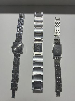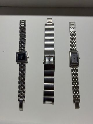 Lotteria di tre orologi al quarzo da donna. Design elegante e moderno. Bracciali metallici. Casse rettangolari e quadrate.