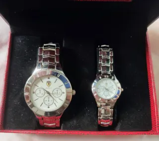 Set di due orologi, uno da uomo e uno da donna. Design elegante con dettagli argentati. Quadranti bianchi.