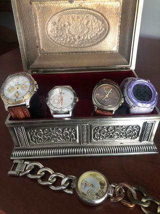In vendita orologi, uno da uomo e gli altri da donna, l'orologio digitale viola in omaggio, tutti funzionano senza problemi, i prezzi dipendono dal modello, il portagioie bianco in omaggio, l'altro argentato molto bello vale 15 euro, anche la bigiotteria il prezzo varia, meglio chiedere. Portagioie di metallo con dettagli ornamentali. Orologio con cinturino in pelle marrone e quadrante bianco. Orologio con cinturino in pelle marrone e quadrante bianco con orsetto. Orologio con cinturino in pelle marrone e quadrante marrone. Orologio digitale viola. Orologio con grandi maglie e quadrante decorato.