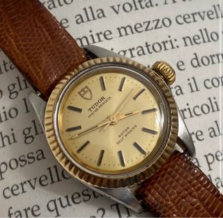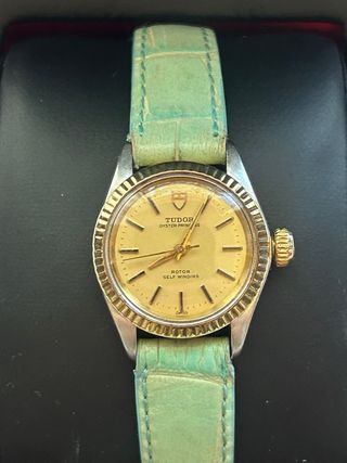 Orologio Tudor Oyster Princess Automatico - Rif. 76151 - Anni '70. In vendita: autentico orologio vintage Tudor Oyster Princess, riferimento 76151, anni '70 (circa 1977-1979). La cassa elegante in acciaio Oyster con bisello dorato scanalato, e la raffinata sfera champagne originale con una bella patina uniforme in accordo con la sua età. Riferimento: 76151. Numero di serie: 886xxx. Periodo: fine anni '70. Diametro: circa 25 mm senza corona, 27 mm con corona. Cassa: acciaio Oyster. Bisello: oro striato. Cinturino: non originale (sostituito).