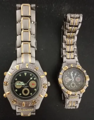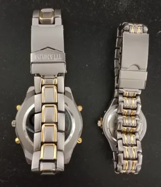 Set di due orologi da polso con dettagli in oro e argento. Realizzati in titanio. Design elegante e moderno.