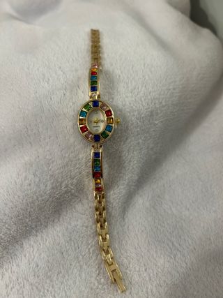 Elegante orologio da polso da donna con un design vivace e colorato. - Cinturino in metallo dorato. - Quadrante con pietre colorate. - Dettagli con pietre colorate sul cinturino.