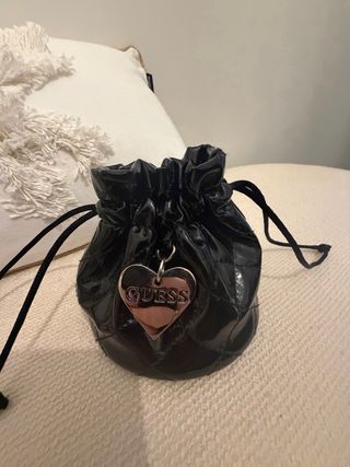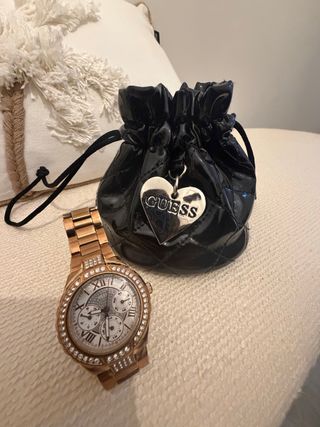 Elegante orologio Guess in oro con dettagli brillanti sul bisel. Include una borsa nera con charm a forma di cuore. Design multiplo quadrante. Cinturino a maglie dorate. Borsa in pelle nera con chiusura a cordoncino. Usato ma funzionante. Orologio originale acquistato da El Corte Ingles. Prezzo negoziabile.