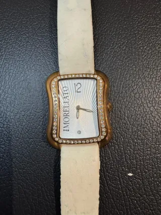 Elegante orologio da donna con cinturino bianco e cassa dorata impreziosita da cristalli. - Quadrante con finitura a raggiera in perfette condizioni. - Dettaglio con piccolo cristallo a ore 6. - cinturino da sostituire