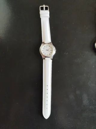 Orologio da polso con cassa in acciaio e cinturino in pelle bianca. - Quadrante bianco con indici e lancette argentate. - Chiusura con fibbia. - Design elegante e moderno.