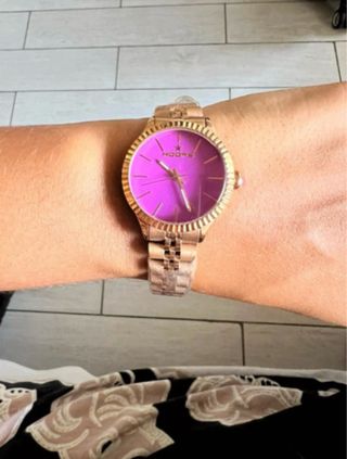Elegante orologio Hoops con cassa e cinturino color oro. Il quadrante è di un vivace color fucsia. - Cassa e cinturino in metallo color oro. - Quadrante rotondo color fucsia. - Logo Hoops sul quadrante.
