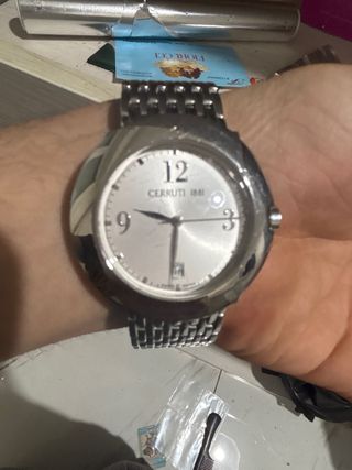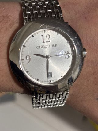 Elegante orologio da polso con cinturino in metallo. - Quadrante bianco con numeri arabi. - Datario presente sul quadrante. - Logo CERRUTI 1881 ben visibile.