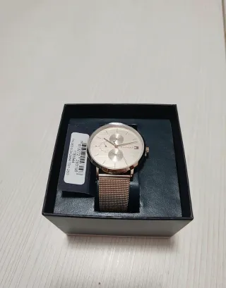 Orologio Tommy Hilfiger da donna, modello multifunzione al quarzo. Colore rose gold, cassa e cinturino in acciaio inossidabile a maglia. Design elegante e moderno, adatto sia all’uso quotidiano che a occasioni formali. Resistenza all’acqua 3 ATM. Condizioni: nuovo, mai indossato, completo di scatola originale. Vendo come da foto