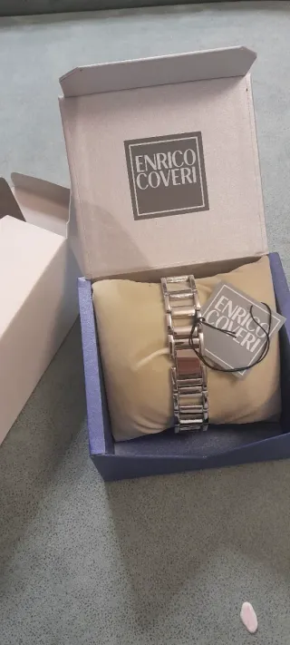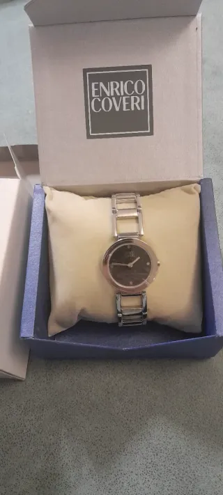 Elegante orologio da polso Enrico Coveri con cassa rotonda. Cinturino in metallo argentato. Quadrante scuro con indici.