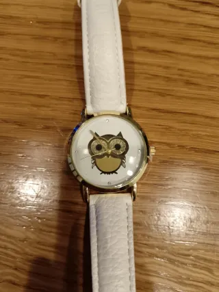 Orologio da polso con un simpatico gufo sul quadrante. - Cinturino in pelle bianca. - Dettagli dorati sul quadrante e sulla cassa. - Quadrante bianco con indici a puntini.