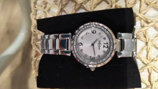 Elegante orologio Fossil da donna con dettagli luminosi. Mai usato Con batteria nuova - Cassa e cinturino in color argento. - Quadrante bianco con indici. - Lunetta impreziosita da strass. - Tre contatori sul quadrante. - Indicatore del calendario.