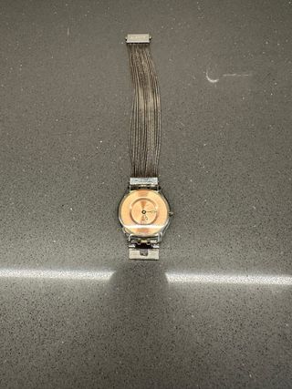 Elegante orologio Swatch da donna con un design unico. - Cassa trasparente. - Quadrante color oro. - Cinturino in maglia metallica color argento. - Batteria nuova