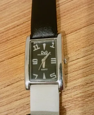 Elegante orologio da polso con cassa rettangolare. - Cinturino in pelle nera e bianca. - Quadrante nero con logo D&G.
