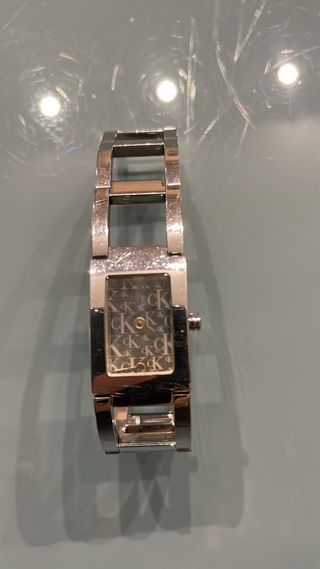 Elegante orologio da polso Calvin Klein con cinturino in metallo. - Cassa rettangolare. - Quadrante con logo ripetuto. - Finitura color argento.