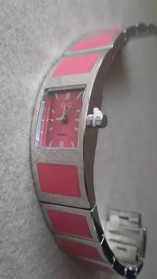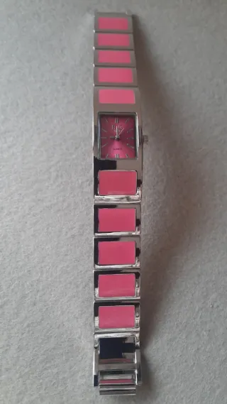 Elegante orologio da polso da donna con un design moderno. - Quadrante di colore rosa vivace. - Cinturino in metallo color argento. - Movimento al quarzo.