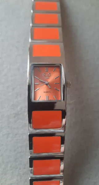 Elegante orologio da polso da donna con un design moderno. - Quadrante rettangolare color arancio. - Bracciale in metallo argentato con inserti rettangolari arancioni. - Movimento al quarzo.