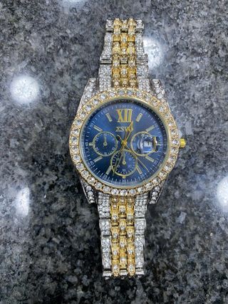 Elegante orologio da uomo con finiture scintillanti. - Design bicolore oro e argento. - Dettagli in strass. - Quadrante blu. - Cinturino robusto.