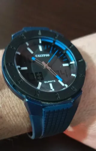 Orologio uomo Calypso Street Style modello K5629, noto per il suo stile sportivo. Indossato in pochissime occasioni, è in ottime condizioni come nuovo, senza parti usurate o graffi. Caratteristiche principali: - Brand: Calypso (del gruppo Festina) - Movimento: Quarzo analogico - Materiale cassa: Plastica nera - Diametro cassa: 49.1 mm - Materiale cinturino: Gomma/plastica di colore blu - Impermeabilità: 10 ATM (100 metri), adatto per sport acquatici - Quadrante: Nero con indici bianchi e lancette azzurre.