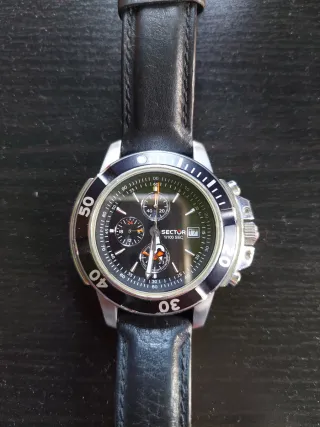 Orologio da polso Sector con cronografo. Cronografo da uomo Sector No Limits della serie 240, identificato dal numero di modello R3251945225 Caratteristiche Principali Movimento: Al quarzo Funzioni: Cronografo con precisione al 1/100 di secondo e datario posizionato a ore 3 Cassa in acciaio inossidabile e cinturino in pelle nera con cuciture in tinta Presenta un quadrante nero con tre contatori e una lunetta girevole unidirezionale con scala sessagesimale. Il set include l'orologio con cinturino in pelle nera, il manuale di istruzioni per il modello "Chrono 0500" e certificato di garanzia Usato ma ottimo stato come da foto