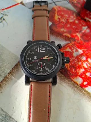 Elegante orologio da uomo con cinturino in pelle. - Cassa nera. - Cinturino marrone con cuciture rosse. - Quadrante nero con dettagli in carbonio.