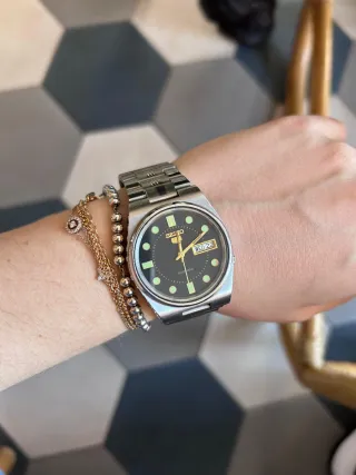 Seiko 5 Automatic anni ’90 – Quadrante Nero – Acciaio Inox Vendo splendido Seiko 5 originale anni ’90, in acciaio inox, con iconica cassa integrata dal design sportivo vintage. Movimento automatico Seiko (no batteria) Funzione day-date a ore 3 Quadrante nero opaco con indici luminosi Sfere dorate con lume Cassa in acciaio satinato con lunetta liscia Corona a ore 4 Bracciale originale in acciaio inox Vestibilità comoda e proporzionata, adatta sia a polsi medi che piccoli Orologio funzionante. Come da foto, condizioni prossime a nuovo pur essendo anni 90. Vetro e cassa in buone condizioni generali (vedi foto). Disponibile