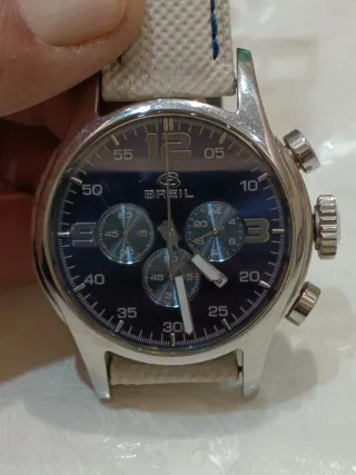 Elegante orologio Breil da uomo con quadrante blu e cassa in acciaio. - Cronografo. - Cinturino in tessuto. - Dettagli in argento. Perfettamente funzionante come nuovo diametro cassa 45 escluso corona e tasti cinturino non originale