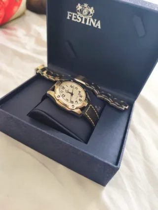 Elegante orologio da uomo Festina con cassa in acciaio e cinturino in pelle nera. - Quadrante bianco con indici a numeri arabi. - Movimento al quarzo. - Datario. - Chiusura con fibbia. - Scatola originale inclusa.