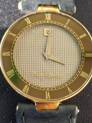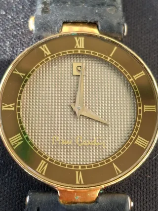 Elegante orologio da polso Pierre Cardin con cassa dorata e cinturino nero. - Quadrante con motivo geometrico. - Indici a numeri romani. - Logo Pierre Cardin sul quadrante.