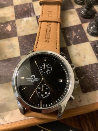 Elegante orologio da uomo MEGALITH con cinturino in pelle. - Quadrante nero con dettagli. - Movimento cronografo. - Datario. - Cinturino in pelle marrone. - Chiusura con fibbia.