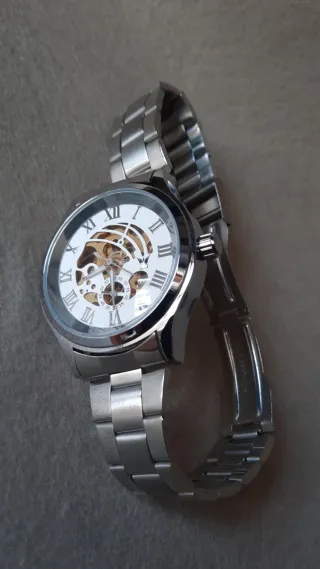 Elegante orologio automatico da uomo con movimento a vista. - Cinturino in metallo argentato. - Quadrante bianco con numeri romani. - Design scheletrato che mostra il meccanismo interno.