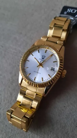Orologio da polso automatico con un design elegante che combina tonalità oro e argento. Il quadrante presenta indici luminosi e un datario. - Movimento automatico. - Quadrante color oro. - Lunetta scanalata. - Cinturino bicolore oro e argento.
