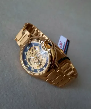 Elegante orologio automatico da uomo con un design bicolore che combina tonalità oro e argento. Il quadrante scheletrato offre una visione affascinante del meccanismo interno. - Movimento automatico. - Quadrante scheletrato. - Indici a numeri romani. - Cinturino in metallo bicolore.