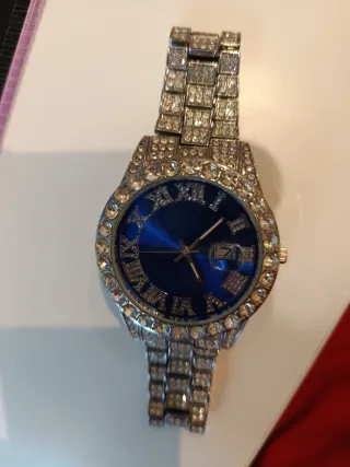 Orologio elegante con un design accattivante e dettagli brillanti. - Lunetta e cinturino decorati con cristalli. - Quadrante di colore blu intenso. - Indicatore della data.