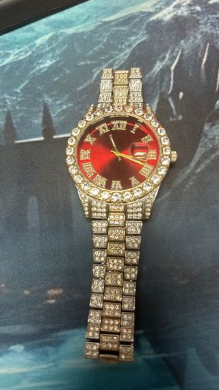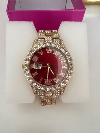 Orologio elegante con un design accattivante e dettagli brillanti. - Quadrante di intenso colore rosso. - Lunetta e cinturino decorati con cristalli. - Dettagli in tono dorato.