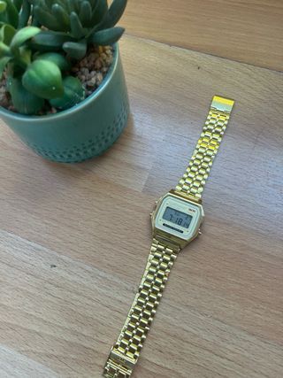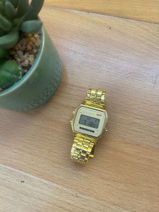 Orologio digitale elegante con finitura dorata brillante. Un accessorio che aggiunge un tocco di distinzione. Design moderno e accattivante. Cinturino metallico regolabile.