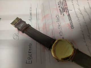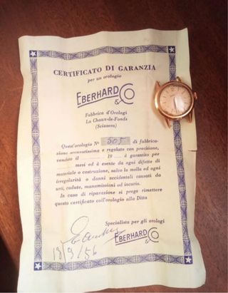 Certificato di garanzia originale per un orologio Eberhard. - Modello: Eberhard & Co. - Fabbrica d'Orologi La Chaux-de-Fonds (Svizzera) - Numero di fabbricazione: 505 - Data di vendita: 13/9/56 - Garanzia per 19 mesi dal difetto di materiale o costruzione. - Esclude danni accidentali da urti, cadute o incuria. In Oro giallo 18 Kt Eberhard prettamente Femminile e perfettamente funzionante senza cinturino accompagnato dalla sua garanzia originale e custodia dell'epoca.movimento meccanico a carica manuale misura 25 mm colore quadrante avorio