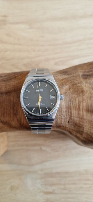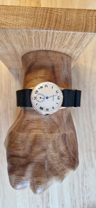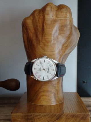 Orologio con bellissimo quadrante bianco con numeri romani e lancette bluastre in buone condizioni. Marca Vulcain, modello «Gran Prix». È dotato di un calibro firmato manifattura V110. Stesso produttore del modello Cricket con sveglia chiamato orologio «Presidents». Cassa in oro 18k da 33 mm. Perni dorati fissi. Corona un po' usurata. Nuovo cinturino NATO nero da 16 mm con fibbie dorate, anche se il cinturino originale in pelle è fornito anche per chi vuole/sa come restaurarlo. Funziona bene, anche se ne avrai bisogno recensione. Collegamenti # Stop, Omega, Duward, Diver, Dogma, Tavannes, Vulcain, Tissot, Certina, Festina, Fortis, Glicina, Zenith, Girard, Eberhard, Girardo,
