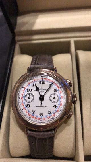 Vendo orologio Eberhard & Co. Cronographe, Ref. 31008 del 1980, carica manuale, cassa in argento di 38 mm., vetro Plexiglas, movimento manuale Eberhard &Co., quadrante bianco porcellana, revisionato e in ottime condizioni, appena trattabile.