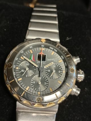 Eberhard frecce tricolori quadrante grigio contatori ore minuti secondi l'unica cosa che è spento il piccolo display data movimento svizzero eta fondello a vite. Corona unica nel suo genere bracciale regolabile molto bello