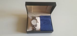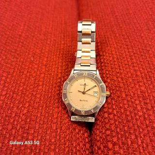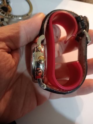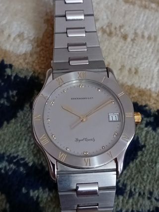 Orologio da donna al quarzo autentico Eberhard in ottime condizioni. Soltanto il cinturino mostra qualche segno e piega dovuti all'indossamento, come da foto. Perfettamente funzionante con pila di recente sostituzione. Resistente all'acqua fino a 3 atm, diametro esterno corona 2,5 cm c.a.