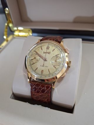 Marchio: EBERHARD & CO Modello: Cronografo Extra-Fort Oversize. Referenza: 14007 Anno: '50s Movimento: meccanico a carica manuale, calibro 14007, con smistamento della cronografia mediante ruota a colonne. Funzioni: ore, minuti, secondi, cronografo. Cassa: oversize, interamente in oro 18 Kt. Ghiera: liscia Corona: zigrinata Pulsanti: rettangolari, il pulsante ad ore 2 consente al cronografo di funzionare come un monopulsante. Anse: curve, con attacchi maschi tipici degli anni '50; attacco 20mm. Dimensioni: 39 mm corona esclusa, 44 mm alle anse. Vetro: plexi Fondello: a pressione Quadrante: bianco/argentè.